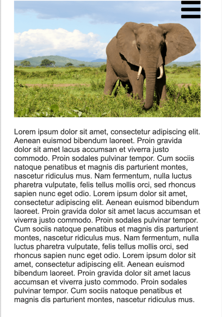 Vi anpassade vår hemsida efter en iPhone x:s skärmstorlek. Vi valde att lägga menyn som en hamburgermeny i det högra hörnet. Främst för att detta är ett vanligt sätt att anpassa en hemsida till en mindre typ av skärm, men även för att det underlättar för användaren att menyn ligger mer kompakt jämförelse om det skulle ligga efter varandra vågrätt eller att användaren tvingar scrolla sig igenom sidan för att kunna nå menyn. För att optimera hemsidans layout förminskade vi storleken på bilden och komprimerade texten.