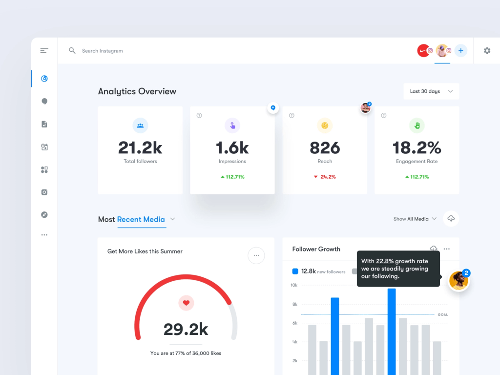 Det dashboard som visas ovan är till för influencers i sociala medier såsom Instagram. Med hjälp av detta kan de analysera deras följare och hur se om det går uppåt eller nedåt. Detta är ett bra exempel då hela utformandet är väldigt enkelt och tydligt. Den viktiga informationen visas i fetstilt text vilket gör att man enkelt ser den. Ikonerna förtydligar vad informationen handlar om och den röda mätaren i nere i det vänstra hörnet är en perfekt överblick för ett mål som personen har satt upp, eftersom att den visar tydligt hur långt man har kommit och hur långt det är kvar för att nå målet. Detta upplägg gör det enkelt för användaren att överblicka informationen – vilket är syftet med ett dashboard.