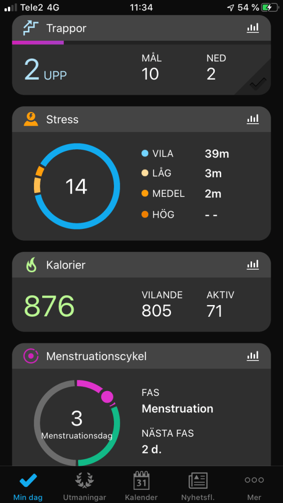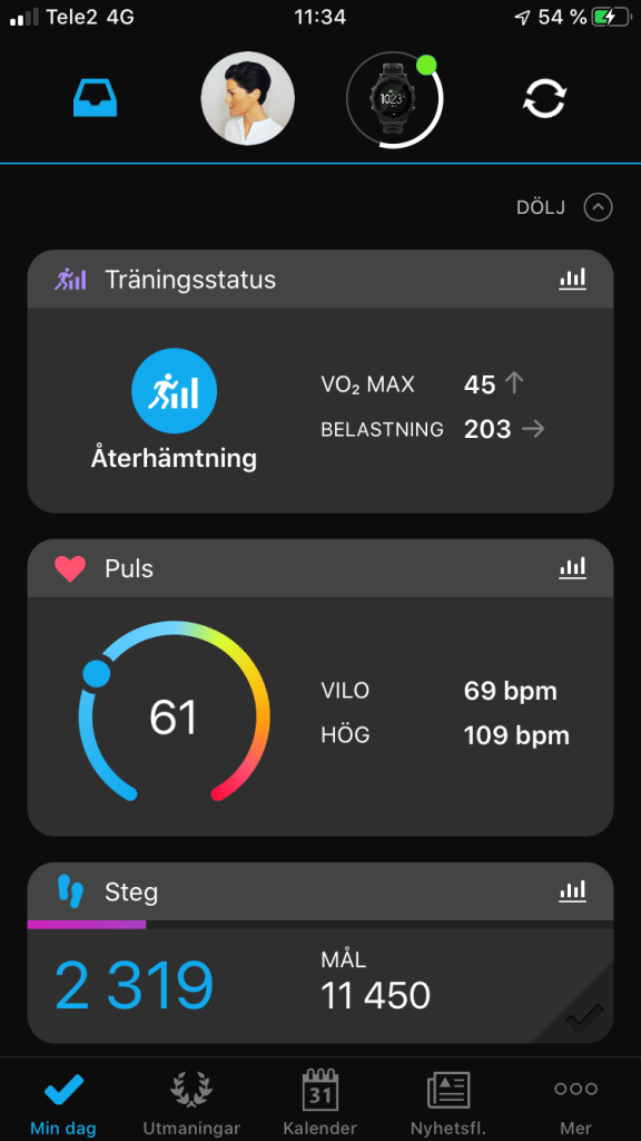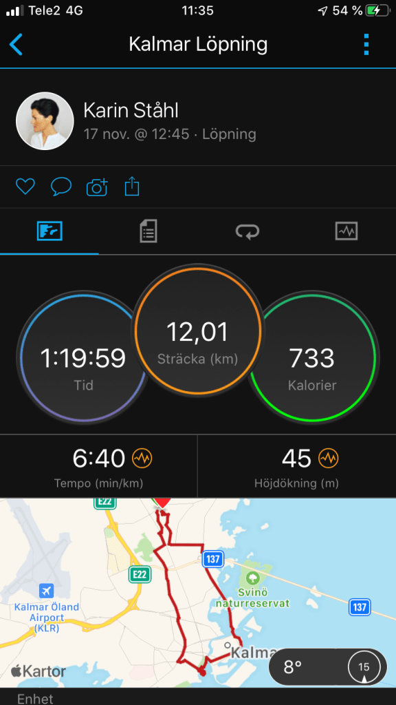 På dom två bilderna nedan ser vi hur det ser ut när vi går in i appen. Det är en översikt över dagen, här visas generell information på ett överskådligt sätt och beroende på vad vi vill ta reda på just nu så kan man klicka sig vidare. På bild tre och fyra kan man gå in på en specifik löprunda som gjordes i söndags för att komma år mer specifik data. Det är lätt att skilja data åt och det är lätt att ta sig vidare för att få ut mer information.