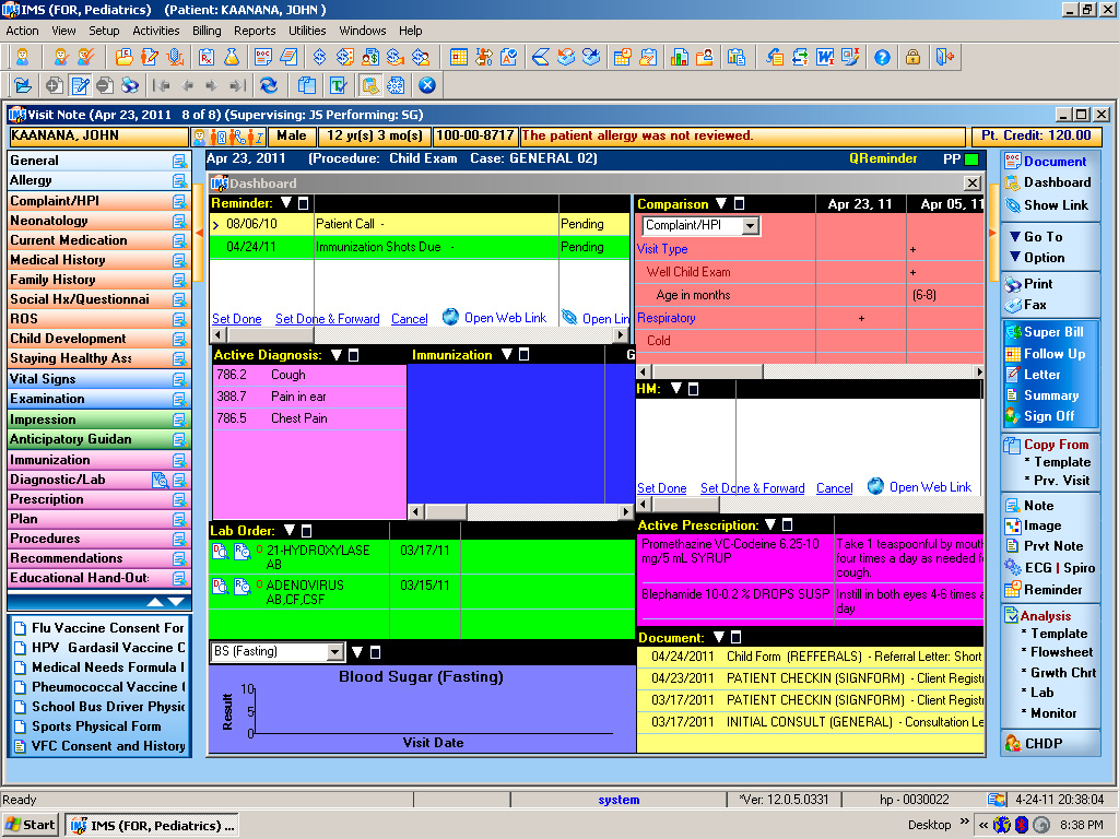 Det dashboard som visas ovan innehåller alldeles för många färger utan någon riktig struktur. Troligen är tanken med detta att varje färg ska representera ett visst ämne – men istället blir det väldigt rörigt med massa färger överallt och dessutom är vissa av färgerna så starka att det blir svårt att se texten som står på de. I rutan längst upp till höger används också en röd färg på en rosa bakgrund, vilket gör att den blir väldigt svår att läsa. Det känns överlag som att det är svårt att få en överblick av informationen i detta gränssnitt, vilket är tanken med ett dashboard. Detta på grund av färgerna som redan nämnt men också för att det är alldeles för mycket information på skärmen. Överst står det en röd text om att “the patient allergy was not reviewed”, vilken är en viktig information men som totalmissas om man inte tittar noga, på grund av att texten inte passar till bakgrunden och smälter in med all annan information. Kanske skulle man kunnat sålla bort det som inte är lika viktigt?