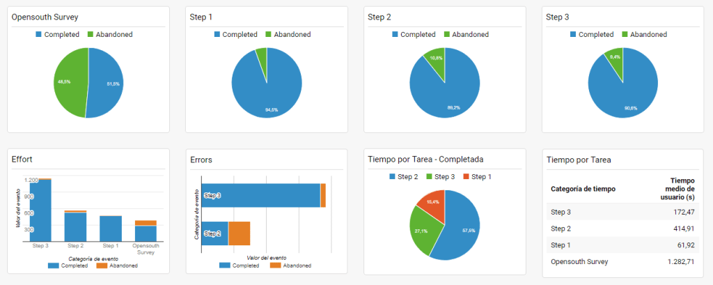 Det dashboard som visas ovan ser till en början ganska bra ut, men en stor miss har gjorts med färgerna. I den första raden är blått = completed, och grönt = abandoned. I den andra raden har helt plötslig den gröna färgen bytts ut till orange – trots att den ändå representerar abandoned. Dessutom används samma färger, blått, grönt och orange – till ett cirkeldiagram där de representerar helt andra saker än innan. Detta gör att man lätt blandar ihop färgerna och inte riktigt vet vad som är vad, och vid en snabb överblick kan man därför lätt missförstå informationen. Färgerna skulle ha använts mer konsekvent och flera färger bör inte representera samma sak.