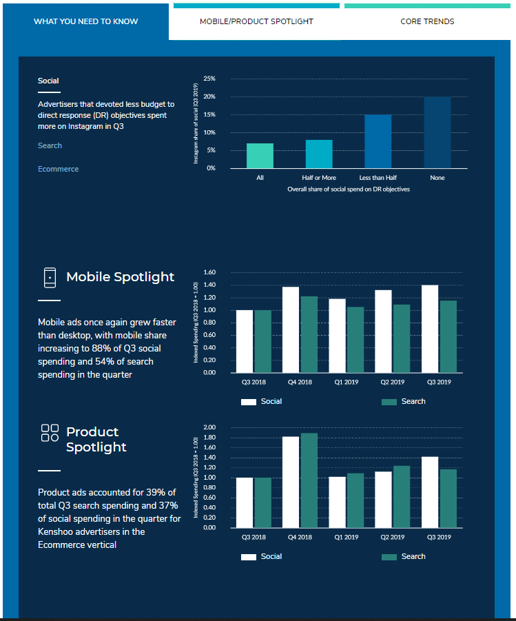 Den dashboard som kenshoo.com använder för att presentera marknadsinformation efter en analys är ett bra exempel på en dashboard enligt oss. De har använt sig utav visuellt lockande grafik för att presentera informationen samt har en viss interaktivitet på tabellerna för att presentera mer exakt information gällande statistiken. Designen av dashboarden är också anpassningsbar beroende på vilken sektion av dashboarden du befinner dig på men ej anpassningsbar på den aspekt att du själv kan välja vilken typ av information du vill ta del av.