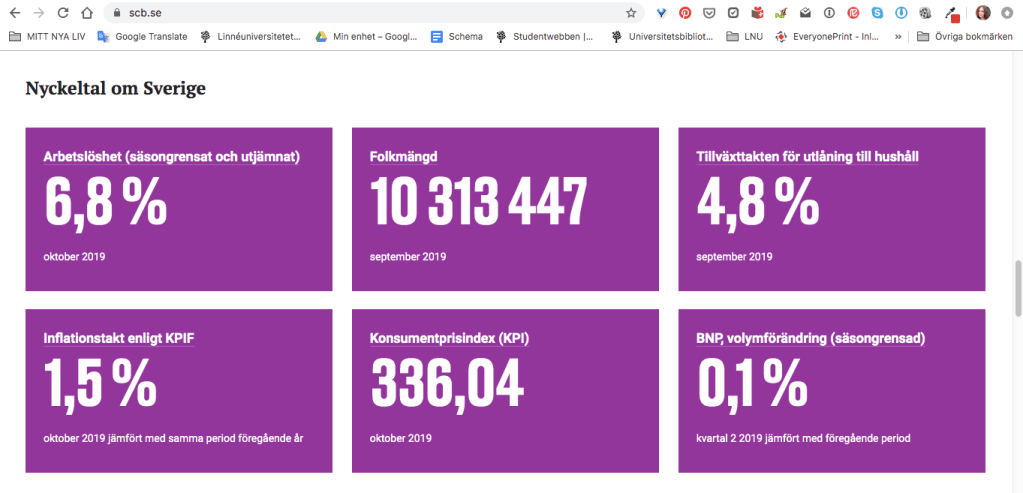 Statistiska centralbyrån, tycker vi är ett dåligt exempel på en dashboard eftersom det trots det olika rutorna lätt flyter ihop mycket på grund av att det är i samma färg på alla rutorna, hade kunnat funka betydligt mycket bättre genom att använda sig av olika färger för dom olika rutorna eller annat sätt som kan göra att dom särskiljer sig mer från varandra.