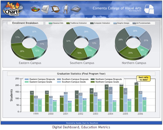 Eftersom att Dundas har använt samma färgskala på diagrammen högst upp och längst ner på bilden gör att det blir otydlig information. Man kan tro att dom hör ihop eftersom färgen är densamma, men det är just det dom inte gör. Även att använda 3D-grafik på diagrammen på toppen av webbplatsen gör att informationen är svårläst.