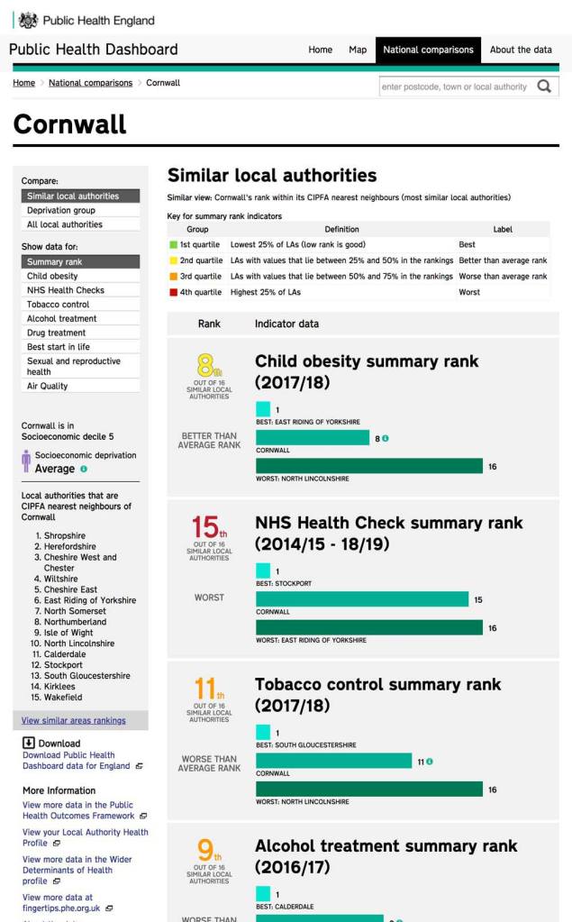 Dåligt exempel: The Public Health Dashboard är en statlig service som visar information över den allmänna hälsan på populationen i diverse län i Storbritannien. Syftet är, enligt organisationen som tagit fram den, att göra den här informationen tillgänglig för allmänheten. Trots detta använder de fackspråk och förkortningar som saknar datatips med förtydliganden. Här finns också många otydliga titlar och ingen möjlighet att klicka på dem för att få mer information. För att få reda på vad som faktiskt har mätts, måste man lämna dashboarden genom den lokala navigationen. Dashboarden är dessutom stor och kräver mycket scrollande – här finns det heller ingen möjlighet att anpassa eller koncentrera informationen.