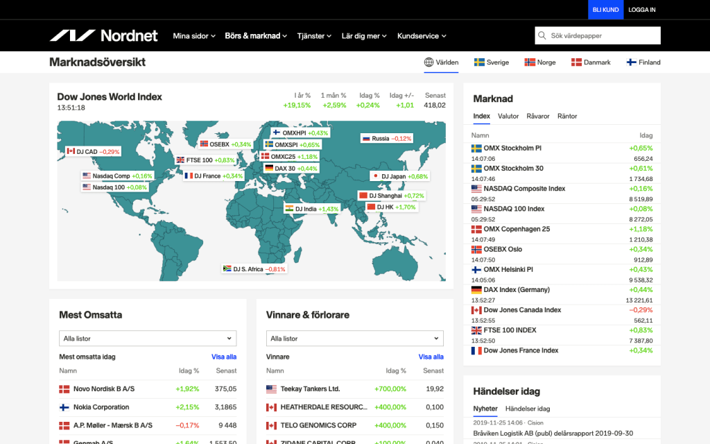 Nordnets undersida “Marknadsöversikt” skapar en god överblick över mycket information som presenteras samtidigt. Detta uppnås genom att tydligt gruppera in besläktat innehåll i separata block och att använda en tydlig rubriksättning.