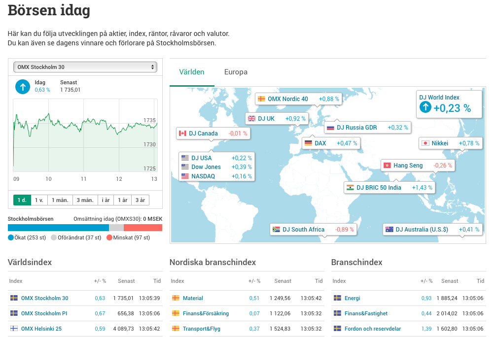 Det finns även en “tidsinställning” som gör att användaren kan enkelt förstå valutor över tid och anpassa efter dag, månad eller år. Grupperingar finns på sidan, där användaren enklare kan se uppdelning av världsindex, nordiska branschindex och branschindex, samt styckesindelning. Detta bidrar till en ökad förståelse.