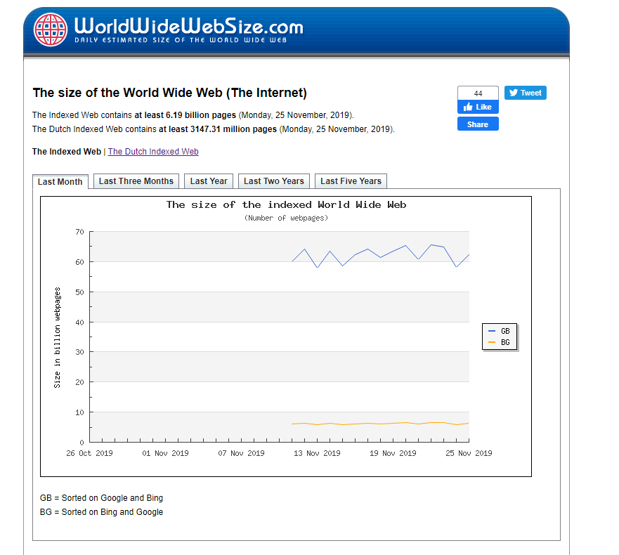 Denna dashboard är framsidan för webbsidan Worldwidewebsize.com vilket är en webbsida som mäter storleken på internet genom att mäta hur många webbsidor det finns. Informationen som finns på sidan är ganska otillräcklig på grund av att man kan filtrera ut informationen på ett väldigt begränsat sätt. Sidan är ej anpassningsbar och flera kategorier såsom mer specifika dagar, vilka typer av sidor/de sökord de använde vid data insamlingen osv. är något som kan förbättras. Informationen presenteras på ett bra sätt men kan här också förbättras genom mer visuellt lockande design på graferna.