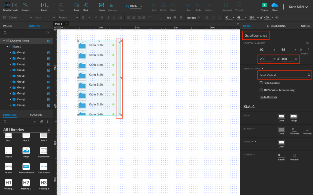 Efter att vi gjort grunden för vår hur chatten ska se ut så markerar vi allt >> högerklickar och väljer >> Create Dynamic Panel. Det som då händer är att vi får upp en meny till höger där vi först döper vår nya dynamic panel, sedan sätter vi bredd och höjd. Viktigt att tänka på är att ge lite yta till sin scrollbar om den ska befinna sig till höger. Efter detta, väljer vi åt vilket håll vi vill scrolla åt. I vårt exempel har vi har valt att scrolla vertikalt. Det som nu kommer hända är att vi kommer få ett chatfönster som liknar på den väldigt kända chatfunktion som används av miljoner användare.