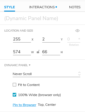 För att fästa en dynamisk panel till webbläsarfönstret klickar du på panelen sedan går du till menyn till höger och klickar på “Style” fliken om den inte redan är öppen. Under rubriken “Dynamic Panel” finns “Pin to browser”, om man klickar på denna öppnas en ny ruta.