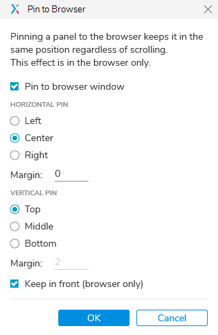 Här finns många olika alternativ för hur man kan ordna panelen i ett webbläsarfönster. Till exempel kan man fästa panelen horisontellt, vertikalt eller både och. Detta gör att man kan fästa panelen antingen högst upp, i mitten eller längst ner i ett webbläsarfönster. Man kan också sätta in marginaler om man vill förskjuta panelen åt något håll för att få den exakt som man vill.