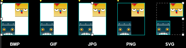 Bilden ovan demonstrerar hur filformaten BMP, GIF, JPG, PNG och SVG presenteras i Axure. Filformaten PNG och SVG presenteras båda med en transparent bakgrund, medan BMP, GIF och JPG presenteras med en vit bakgrund. Värt att notera är det att filformatet SVG behandlar de två bilderna som två separata objekt, vilket visas genom att båda bilderna är markerade. Detta möjliggör fristående redigering av båda bilderna, vilket alltså ej är möjligt i de andra filformaten då filerna behandlas som ett enhetligt objekt.