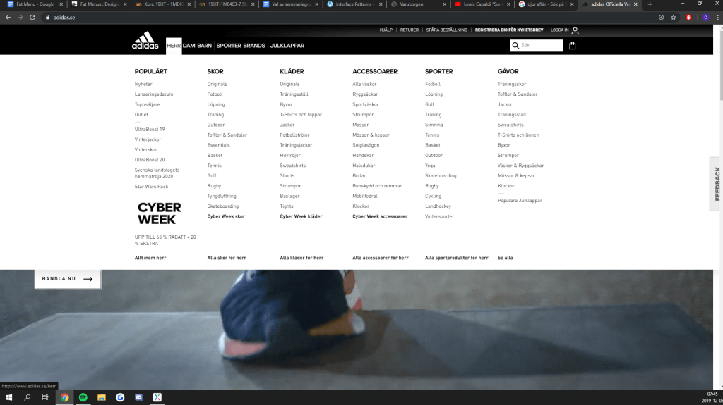 Adidas hemsidan är ett ganska klart exempel på en bra Fat menu. De visar tydlig struktur i deras så kallade “Fat menu”. I deras meny fält presenterar de informationen på ett sätt som gör det lätt för användaren att förstå. Exempelvis genom att ha huvudkategorier som Dam, Herr, Barn, Sporter, Brands och Julklappar som alltid syns i toppen av sidan. Under dessa huvudkategorier har de sedan kategoriserat informationen genom underrubriker som Skor, Kläder, Accessoarer osv. Därefter listas de olika kategorierna inom exempelvis skor eller kläder. De har använt sig utav spacing för att särskilja de olika meny kolumnerna och även gjort en tydlig underline vid “Visa allt” funktionen. Menyn utnyttjar hela bredden på webbsidan och blir därav mer tydlig och enhetlig. Tillsammans med den vita färgen som menybakgrunden får, ser man klart och tydligt var den börjar och slutar. Därför behövs heller inget mörkare filter på resterande sida när menyn blir aktiv då resterande sida är av mörkare karaktär.