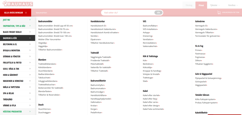På Bauhaus.se så kan man se huvudkategorier på vänster sida av webbplatsen när man trycker på alla avdelning. När man för musen till en kategori så dyker olika rubrik och underrubriker upp till höger sida av huvudmenyer. Man kan tydlig se vilka varor som tillhör vilken kategori och får en bra överblick över hela meny.