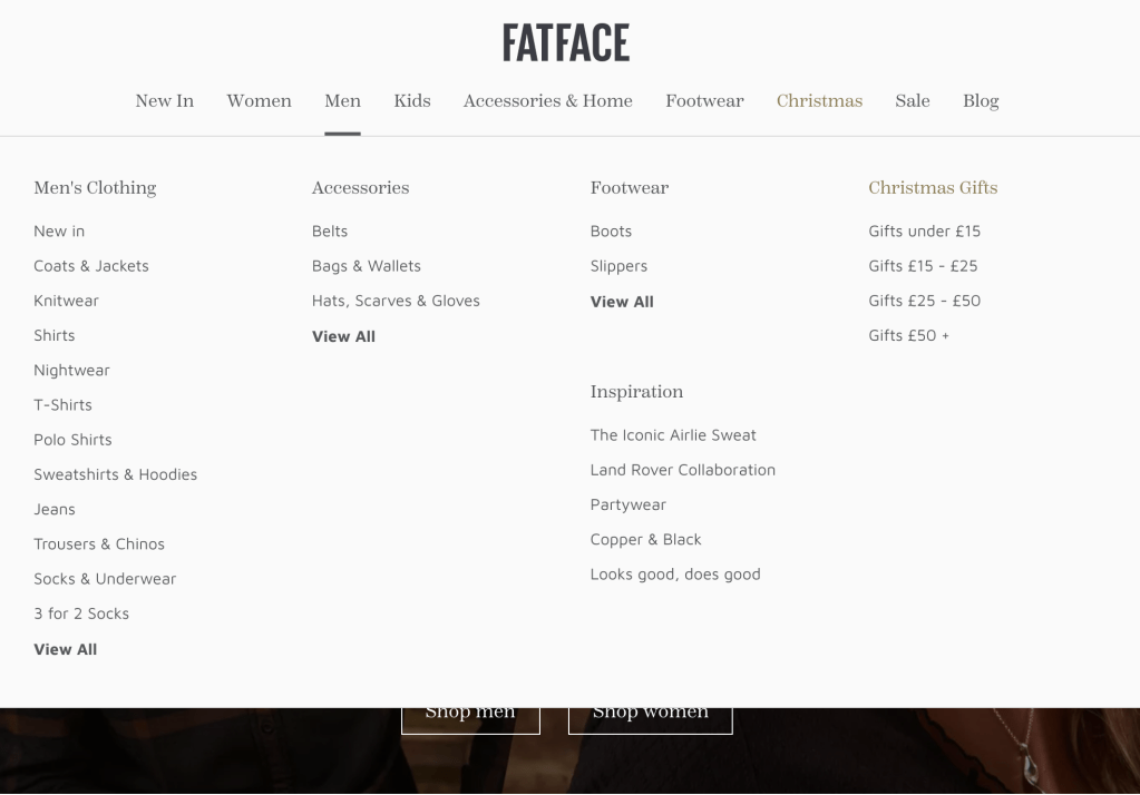 Bra exempel: I den här megamenyn från fatface.com får användaren en snabb inblick i vilken typ av produkter som finns tillgängliga på webbsidan. Underrubrikerna hade kanske kunnat vara något starkare markerade för att förtydliga hierarkin, men det rikliga avståndet mellan mellan kolumner och länkar gör det ändå enkelt att förstå hur innehållet i menyn är organiserat.