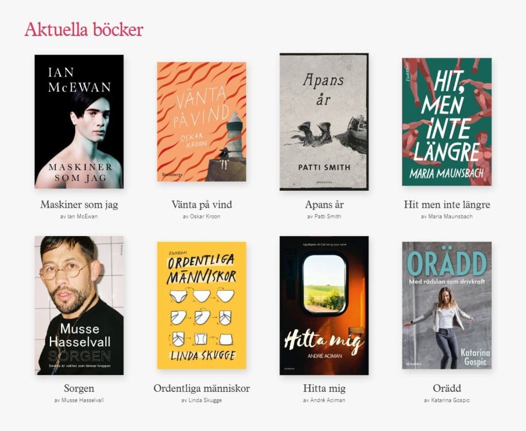 Snyggt, tydligt, bra särskiljning mellan enheter under “Aktuella böcker”. Varje bok är snyggt grupperad med sin tillhörande text.