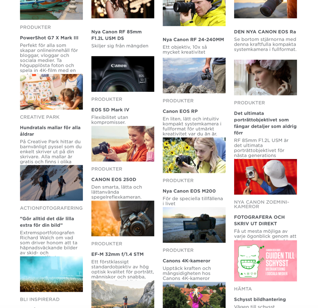 Rörigt och icke-harmonisk helhet. Det är mycket info i vissa beskrivande texter och för lite i andra. Rubrikerna är alla på olika många rader och de beskrivande texterna har olika många rader. Dessutom är texten justerad mot både höger- och vänsterkant vilket skapar enorma sjöar och floder i texterna – det hade varit bättre att antingen arbeta mer med en snygg marginaljustering eller att helt enkelt vänsterjustera alla texter. Vidare hade det varit bra om bild och tillhörande text hade varit tajtare mot varandra för att bilda en tydlig grupp, eller om mellanrummet mellan varje bild/text-grupp varit större.