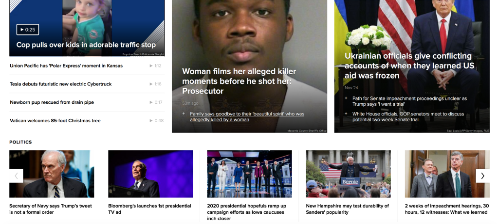 Skynews, som är en brittisk nyhetskanal, har en avskalad webbplats där nyhetsflödet är på förstasidan och allt innehåll är välorganiserat vilket också gör webbplatsen lättnavigerad. Den globala navigationen på sidan gör det enkelt att navigera mellan olika nyhetsflöden och snabbt hitta det man är intresserad av att läsa. Läsandet störs inte av en massa annonser överallt. Allt innehåll är centrerat och ligger i olika block så man tydligt kan skilja på innehållet. Blocken har också kategoriserats efter till exempel, Top Stories, Opinions, Videos.