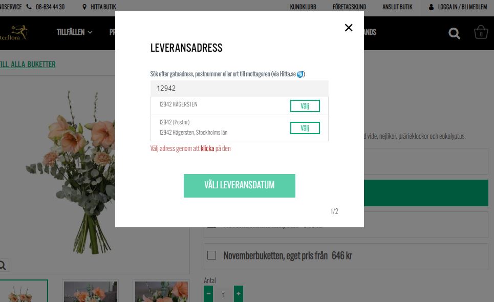 När användaren har valt en blomma och trycker på “skicka som gåva” kommer en ruta upp där responsive disclosure används. Det står i rutan att användaren kan fylla i adress, postnummer eller ort men om användaren enbart skriver orten så måste denna ändå fylla i postnummer, så beskrivningen är fel helt enkelt. Dessutom visas adresserna lite skumt – exempelvis så visas två olika förslag som ser ungefär likadana ut då användaren skriver in sitt postnummer. Även märkligt att användaren först ska klicka i önskat leveransdatum och först därefter får veta om datumet är möjligt. Det hade varit bättre om det enbart möjliga datum hade gått att bocka i.