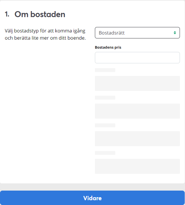 Compricer är ett jämförelsebolag för diverse försäkringar. I exemplet ser vi deras sida för låneansökan för en bostad, där varje svar visar upp en ny del av ”blanketten” som ska fyllas i. För just detta fall kan man dock argumentera för att detta är ett dåligt val. Då stegen innehåller frågor som hör samman, men ej egentligen behöver besvaras efter varandra. Dessa frågor är saker som, för att kunna besvaras korrekt, mest troligt behöver kollas upp av användaren. Om då frågorna ej syns i förhand kan detta betyda att användaren behöver leta upp platsen för informationen flera gånger för att utföra ”blanketten”, istället för att leta upp all information på en gång. För övrigt anser vi det ej finnas någon mening med att leda användaren genom dessa frågor.
