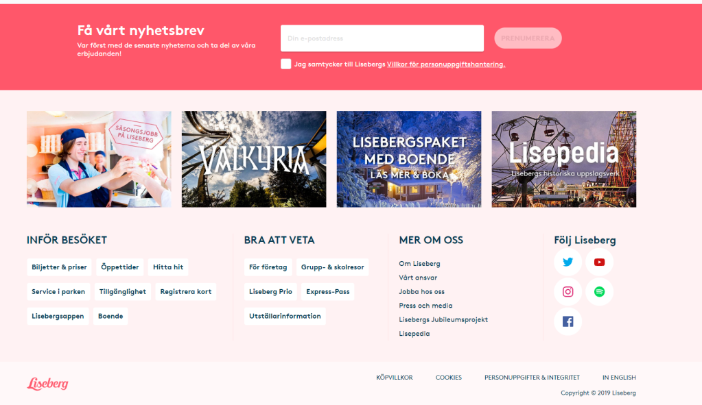 https://www.liseberg.se – Kompletterar huvudmenyn på ett smart sätt eftersom huvudmenyn är mer uppgiftsorienterad. De länkar som visas i footern är tydligt rubricerade i olika kategorier och verkar vara sådan information som många besökare förmodligen letar efter vid besök på webbplatsen. De väljer också att visa fyra bildlänkar till olika utvalda saker, säsongsjobb, Valkyria, boendepaket och Lisepedia, som kan hjälpa användaren att hitta nya delar av siten som den tidigare kanske missat och som kan få den att fortsätta surfa runt. Typisk information som användare förväntar sig att hitta finns också med, så som sociala medier-länkar, “mer om oss” och möjligheten att prenumerera på nyhetsbrev.