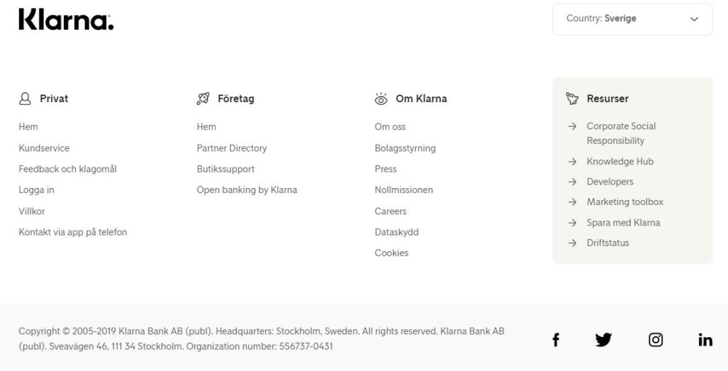 https://www.klarna.com/se/ – Innehåller det som en sitemap footer ska innehålla. Den återupprepar de viktigaste rubrikerna i huvudmenyn med tydliga rubriker och viktiga länkar under, man kan välja land/språk och det finns länkar till sociala medier samt copyright.
