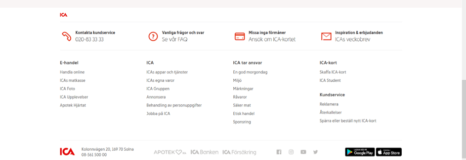 www.ica.se – Footer av Ica:s webbplats har en tydlig struktur och är informativ utan att överbelasta användaren. Ica:s footer presenterar några av de viktigaste huvudkategorierna som det flesta användare behöver (t.ex. handla online, matkassen, kontaktuppgifter till kundservice mm.). Samtidigt kombineras de kategorierna med sekundära uppgifter som kanske inte behövs av användare i första hand men ändå är viktiga för Ica att presentera och för användare att veta t.ex. Icas appar, Icas miljöarbete osv. Informationen i footer är samlad i lite större grupper (E-handel, Ica kort, Kundservice osv.) vilket ger användaren en snabb överblick över hur informationen är strukturerad.