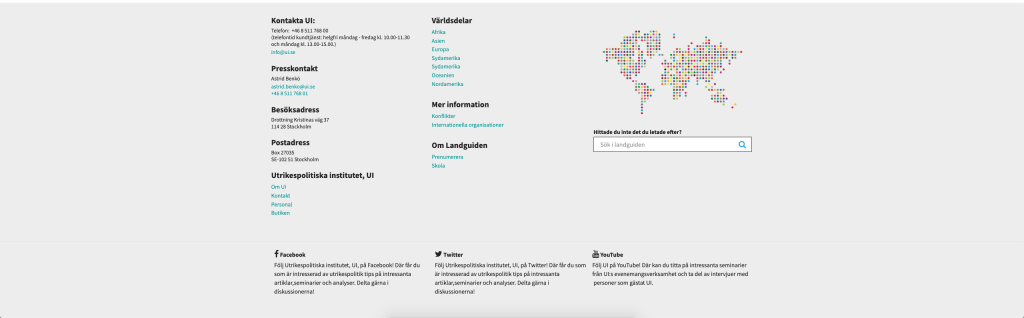 www.ki.se – KI:s footer har en tydlig, avgränsad design på webbplatsen och är enkelt att hitta. Dock har footer väldigt begränsat med information och visar inte de viktigaste kategorierna besökare av webbplatsen kan ha.