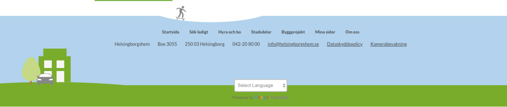 Footer av helsingborgshems webbsida. Den är tydlig och innehåller de viktigaste länkar. Den är inte överlastat med information och länkar utan bara det viktigaste finns med. Alla rubriker är klickbara och de får man till önskade sida för mer information. Kontaktuppgifter finns direkt tillgängliga.