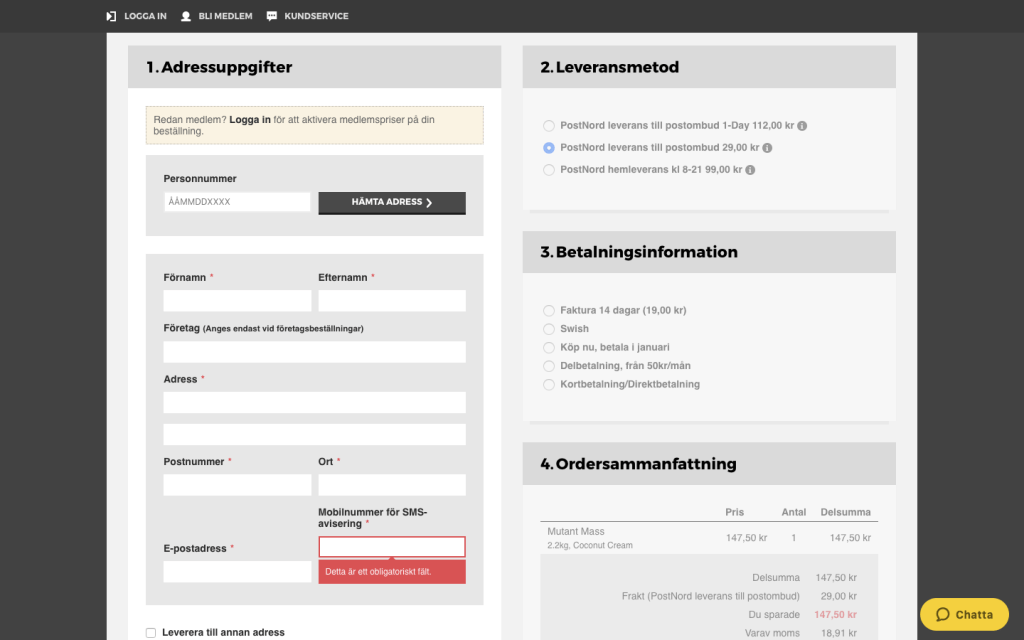 Under utcheckningsprocessen så finns möjligheten att gå tillbaka till föregående steg genom att klicka på de olika numrerade stegen. Det är även möjligt att trycka på länken “Tillbaka till butiken” som avbryter utcheckningsprocessen och för användaren till webbplatsens startsida. Denna handlingsfrihet skapar en känsla av kontroll vilket gör att risken för att användaren ska känna sig infångad begränsas.