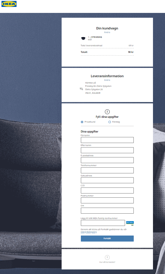 På IKEAs webbsida presenteras man inför en wizard när man ska slutföra ett köp online. De har valt att visa stegen på vertikal nivå där genomförda steg visas överst, nuvarande steg visas i mitten och endast nästkommande steg visas med låg opacitet nederst.
