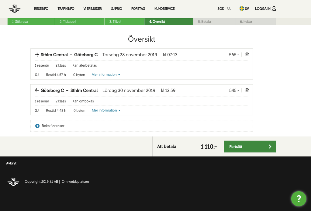 SJ´s webbplattform för bokning av resor visar på en i första anblick väl genomarbetad wizard vad gäller stegvis presenterad information och allmän överblick över bokningsprocess, men som fallerar när användaren vill gå tillbaka i bokningsprocessen. Denna möjlighet finns ej vilket innebär att användaren måste börja om på nytt.